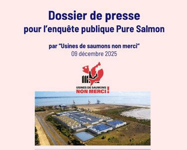 Pour rappel, Pure Salmon promet une “ferme écologique”, qui serait en réalité le plus grand élevage intensif de saumons en fonctionnement au monde. Il est question d’élever près de 3 millions de saumons par an - soit jusqu’à 500 poissons par mètre cube d’eau - dans l’équivalent de près de 250 piscines olympiques construites au coeur du Parc Marin et à la limite d’une Zone de Protection Spéciale Natura 2000. Or, ce type d’élevage, connu sous l’acronyme anglais RAS (Recirculating Aquaculture Systems), est expérimental : aucune usine en fonctionnement dans le monde n’atteint les 10 000 tonnes de saumons par an que Pure Salmon a l’intention de produire, et la technologie de pointe qu’il nécessite est sujette aux incidents techniques et aux erreurs humaines. Depuis 2014, sur 37 usines en fonctionnement, 16 évènements de mortalité de masse des saumons ont été recensés, à la suite de dysfonctionnements. Au Danemark, une fuite de chlorure du fer et un incendie de la même usine ont donné lieu à de graves pollutions du fjord et de l’air.